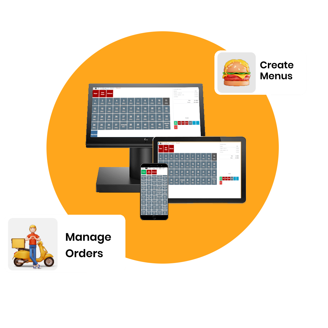 Registrer nye ordre i kassesystemet til storskærm, tablet og mobil enhed og digital ordremodtagelse terminal i køkkenet og baren.